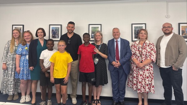 Teachers Miss King and Miss Sharp, Rt Hon Bridget Phillipson Secretary of State for Education, Year 5 and 6 pupils, Lee (Mr P) Parkinson MBE, Headteacher Carla Ferla, MP Daniel Francis, Director of Education Julie Carson and Peareswood Computing Lead Mr Deacon.